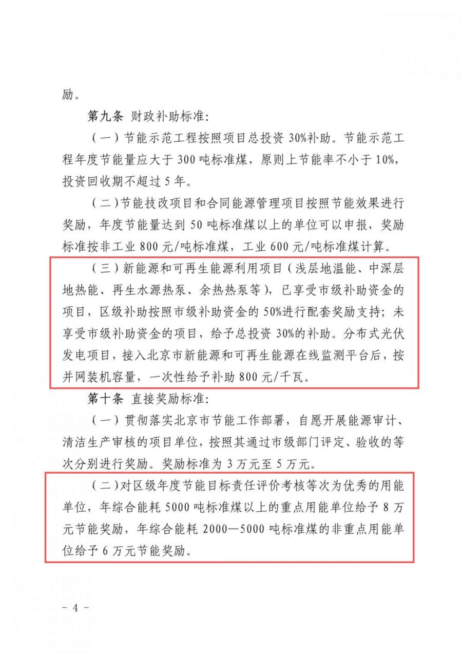 通知明確:新能源和可再生能源利用項目已享受市級補助資金的項目,區級補助按照市級補助資金的50%進行配套獎勵支持;未享受市級補助資金的項目,給予總投資30%的補助。分布式光伏發電項目,接入北京市新能源和可再生能源在線監測平臺后,接并網裝機容量,一次性給予補助800元/千瓦。