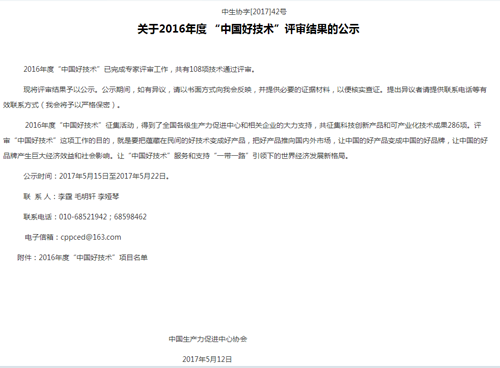 關于2016年度“中國好技術”評審結果公示