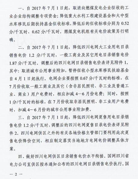 近日,四川省發 改 委發布了《四川省發展和改革委員會關于降低四川電網目錄銷售電價合理調整電價結構有關事項的通知》(以下簡稱“通知”)。通知指出,自2017年7月1日起,取消向燃煤發電企業征收工業企業結構調整專項資金,降低重大水利工程建設基金和中大型水庫移民后期扶持基金征收標準,降低后的征收標準分別為0.52分/千瓦時、0.62分/千瓦時。燃煤發電機組有關電價政策另行明確。具體情況如下: