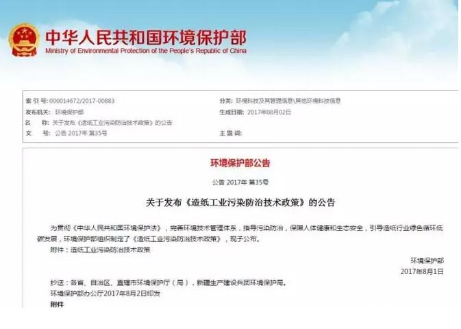 環(huán)保部發(fā)布:關(guān)于造紙工業(yè)污染防治技術(shù)政策