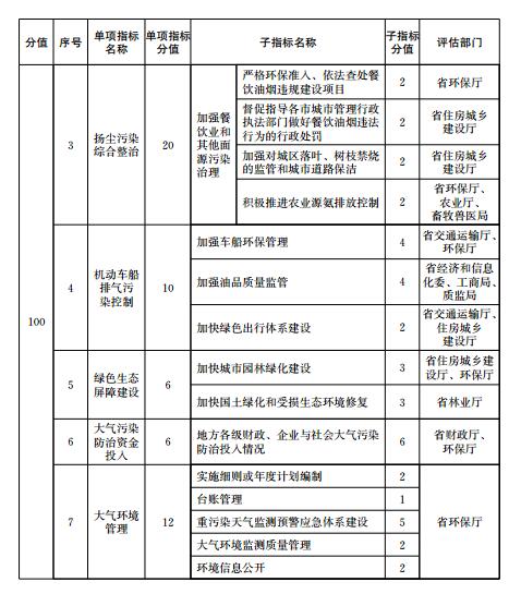 大氣污染防治重點任務完成情況包括能源和產業結構調整、工業污染綜合治理、揚塵污染綜合整治、機動車船排氣污染控制、綠色生態屏障建設、大氣污染防治資金投入、大氣環境管理等7項指標。大氣污染防治重點任務完成情況各指標的定義、評估要求和計分方法等由有關評估部門按照《二期行動計劃》的職責分工確定,評估部門根據子指標分值對各市重點任務進行打分,并向省環保廳提供評分結果。評估部門為兩個部門以上的,各評估部門分別打分后取平均值作為本項重點任務得分。