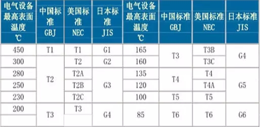 ?。?)引燃某種介質的溫度分組的劃分。主要分為T1-450℃<T、T2-300<T≤ 450℃、T3-200<T≤300℃、T4-135<T≤200℃、T5-100<T≤135 、T6-85<T≤100℃。