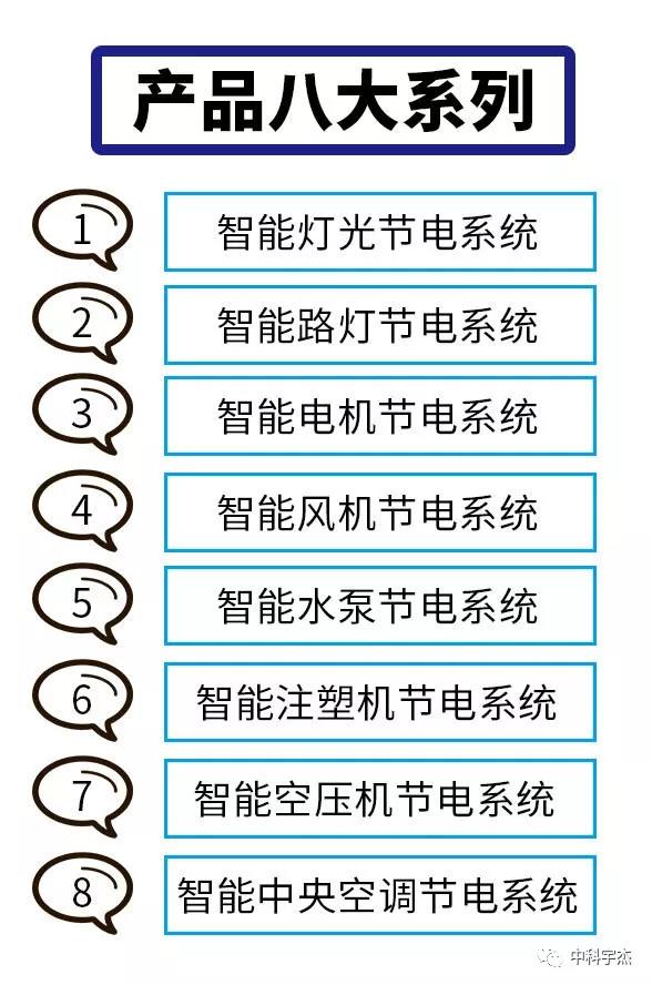 中科宇杰的產品以無縫式嵌入和智能化為核心,特別針對用能單位設備的特點,在完全不影 響用能單位設備正常運行和改變設備運行參數的前提下,達到節電的目的,實現用能設備和中科宇杰節電機的無縫銜接,經過十多年發展,中科宇杰的產品已經形成了8大體系。