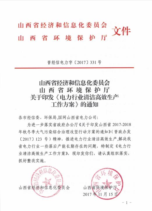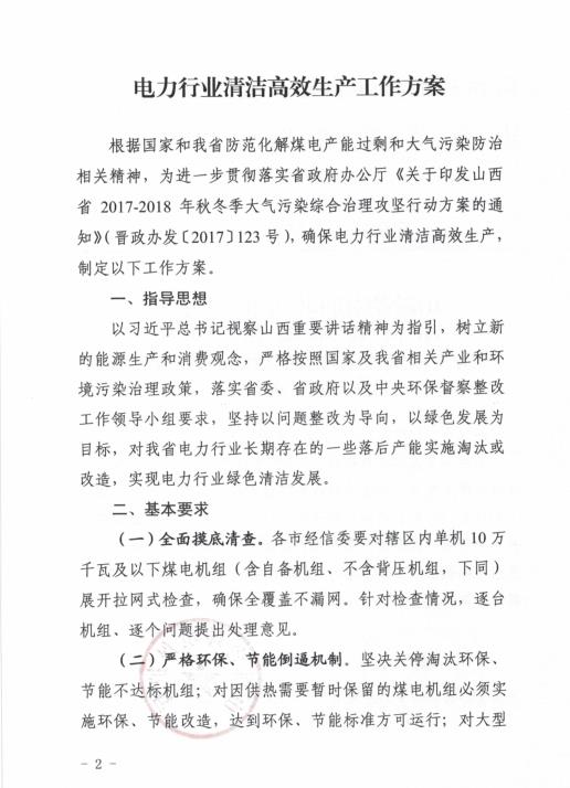 ??為進(jìn)一步落實(shí)省政府辦公廳《關(guān)于印發(fā)山西省2017-2018年秋冬季大氣污染綜合治理攻堅(jiān)行動(dòng)方案的通知》(晉政辦發(fā)〔2017〕123號(hào))精神,推進(jìn)電力行業(yè)清潔高效生產(chǎn),解決我省電力行業(yè)一些落后產(chǎn)能長(zhǎng)期存在的問(wèn)題,特制定《電力行業(yè)清潔高效生產(chǎn)工作方案》,現(xiàn)印發(fā)你們,請(qǐng)認(rèn)真組織落實(shí),抓好整改實(shí)施。