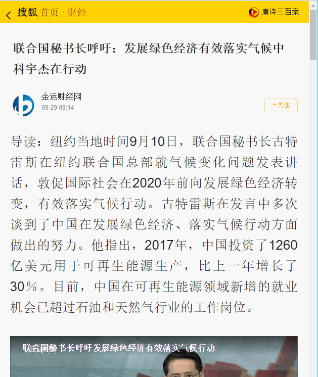 導(dǎo)讀:紐約當(dāng)?shù)貢r(shí)間9月10日,聯(lián)合國(guó)秘書(shū)長(zhǎng)古特雷斯在紐約聯(lián)合國(guó)總部就氣候變化問(wèn)題發(fā)表講話(huà),敦促?lài)?guó)際社會(huì)在2020年前向發(fā)展綠色經(jīng)濟(jì)轉(zhuǎn)變,有效落實(shí)氣候行動(dòng)。古特雷斯在發(fā)言中多次談到了中國(guó)在發(fā)展綠色經(jīng)濟(jì)、落實(shí)氣候行動(dòng)方面做出的努力。他指出,2017年,中國(guó)投資了1260億美元用于可再生能源生產(chǎn),比上一年增長(zhǎng)了30%。目前,中國(guó)在可再生能源領(lǐng)域新增的就業(yè)機(jī)會(huì)已超過(guò)石油和天然氣行業(yè)的工作崗位。