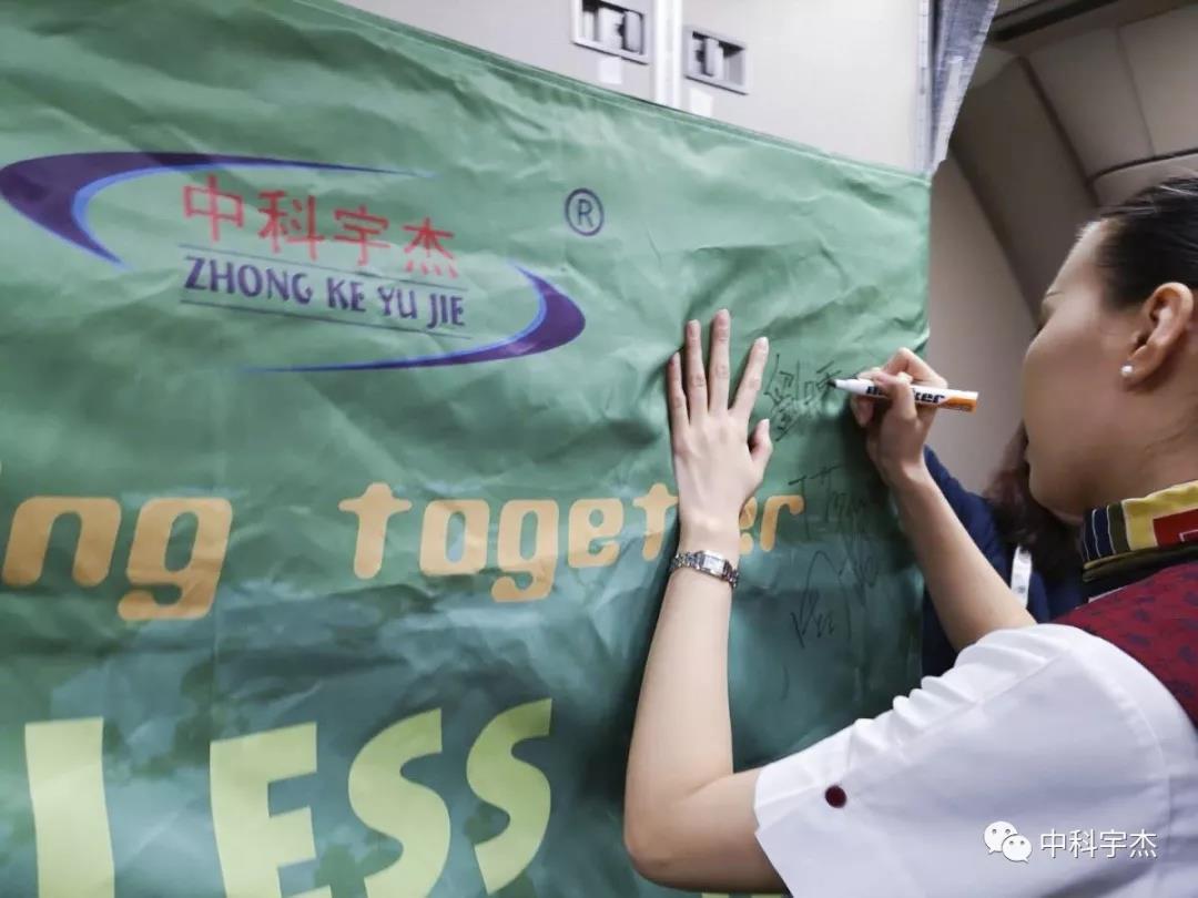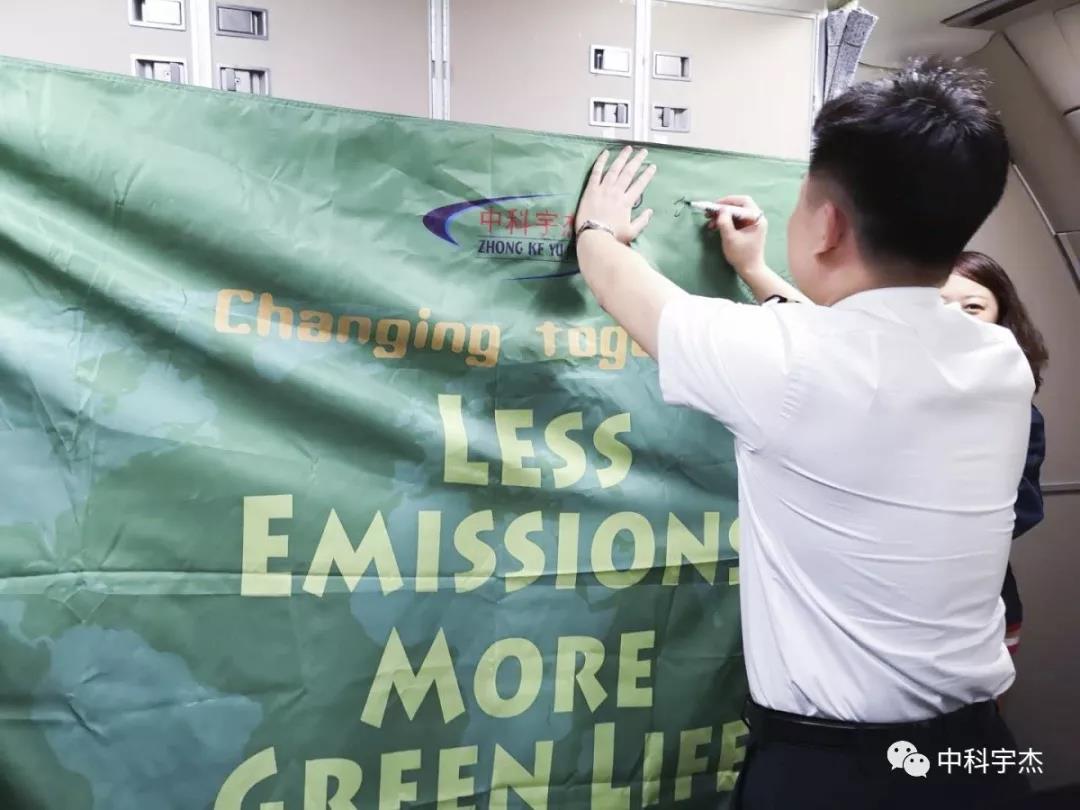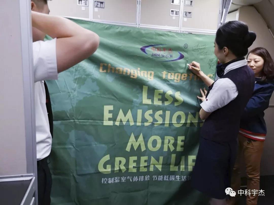 本次公益宣傳愛心傳遞活動得到國航CA877機組成員大力支持,據(jù)乘務長介紹國航一直注重綠色低碳,國航機組成員作為節(jié)能減排的倡導者,保護環(huán)境,人人有責,通過參與中科宇杰本次活動,呼吁全球共同參與,傳遞正能量,積極參與的溫室氣體減排行動。“Less Emissions More Green Life”活動,并在的綠色宣傳旗上簽字,節(jié)能低碳我先行,共同參與,共同倡導,節(jié)能低碳生活新風尚。