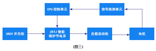 由圖三所示,在低壓380V開關(guān)柜與負載(風機、水泵、空壓機、及電機拖動類)啟動柜之間串接智能保護節(jié)電系統(tǒng),系統(tǒng)在電機的使用上,它能自動跟蹤檢測電機運行中的負載變化,將檢測信號反饋給控制中心,經(jīng)過中央處理,運算放大后給出指令信號,以此來改變有功電量的輸出,使電機在最經(jīng)濟的電耗下運行,達到節(jié)電的目的。